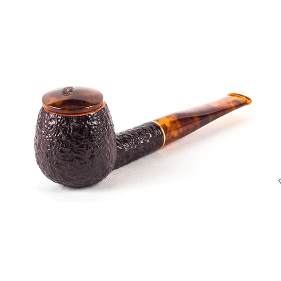The Savinelli Tortuga Rustic Bent Apple 626 elevates Italian pipe-making artistry with its full-bent apple bowl (shape 626) fashioned from premium Sardinian briar. A dramatic black sandblasted finish unveils the wood’s natural grain patterns, contrasted by a smooth, burgundy-stained rim that enhances visual depth and heat dissipation for prolonged, comfortable smokes. Crafted for the modern pipeman, it measures 135mm in length and weighs a mere 44g, balancing perfectly in hand or jaw. The tortoise-shell effect tapered acrylic stem provides a secure, ergonomic clench, while the 6mm filter chamber—with included balsa adaptor—delivers drier, cooler draws by trapping tar and moisture effectively. Scale details include a 37mm bowl diameter and 50mm height, yielding generous capacity without excess bulk. Supplied with a dedicated ash cap for field use, this Tortuga exemplifies Savinelli’s fusion of tradition, innovation, and understated elegance—ideal for daily rotation or collectors seeking rustic refinement.