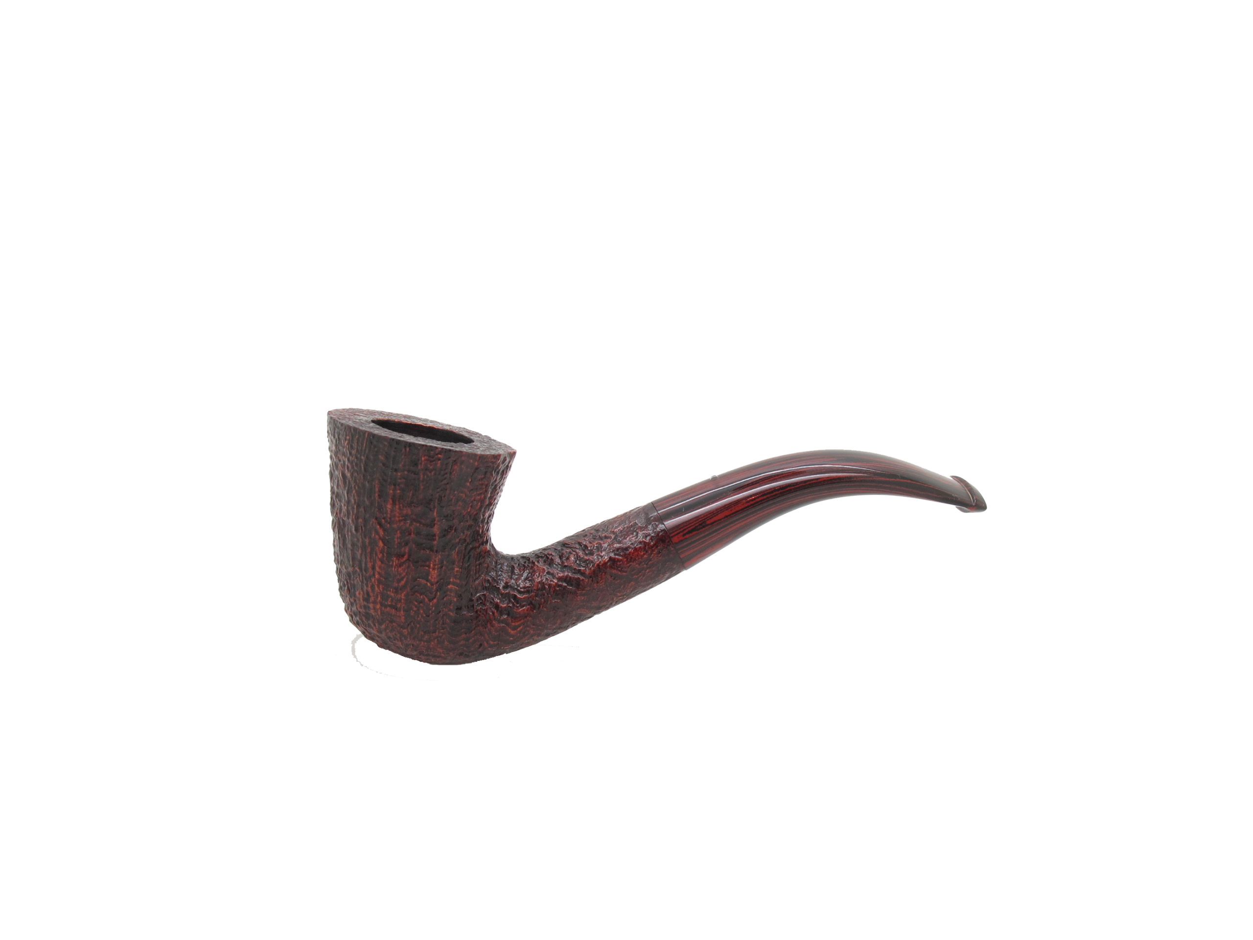 The Alfred Dunhill White Spot Cumberland 4114 is a Group 4 medium Bent Dublin pipe, handcrafted from select Algerian briar with signature dark sandblasted finish revealing intricate grain. Its mottled brown Cumberland fishtail stem ensures comfortable draw and clench, bearing the iconic white spot hallmark of quality. Measuring approximately 140mm long and weighing 45g, it delivers cool, dry smokes without filter. A sterling silver band adds elegant reinforcement.