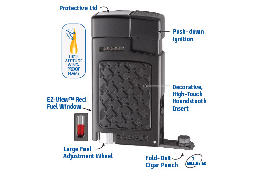The Xikar Forte Soft Flame Cigar Lighter merges classic soft flame reliability with modern engineering, featuring a windproof candle-style flame, EZ-View™ red fuel window, and razor-sharp 7mm fold-out cigar punch in an all-metal body with houndstooth-patterned inserts. Single-action push ignition and oversized adjustment wheel ensure effortless control, tested to 12,000 feet altitude. Available in black, silver, gunmetal, or burl finishes, it weighs 3.6 ounces for balanced pocket use, backed by Xikar’s lifetime warranty.